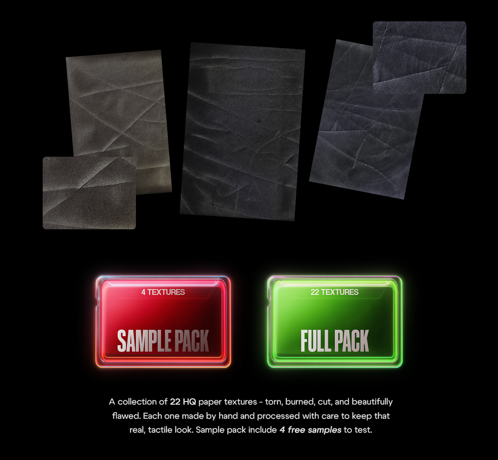 A collection of 22 high-resolution paper textures — torn, burned, cut, and beautifully flawed. Each one made by hand and processed with care to keep that real, tactile look.